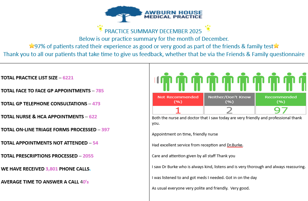 Thank you to all our patients that take time to give us feedback, whether that be via the Friends & Family questionnaire or via Google.